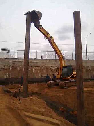 - В низкоплотной почве. Нередко приходится работать на объектах, где даже колебания от работы вибропогружателя вызывают критическое разуплотнение грунта, приводящее к обрушению стенок котлована. Решение проблемы - бурение скважины и установка в нее шпунта с помощью крана.